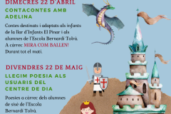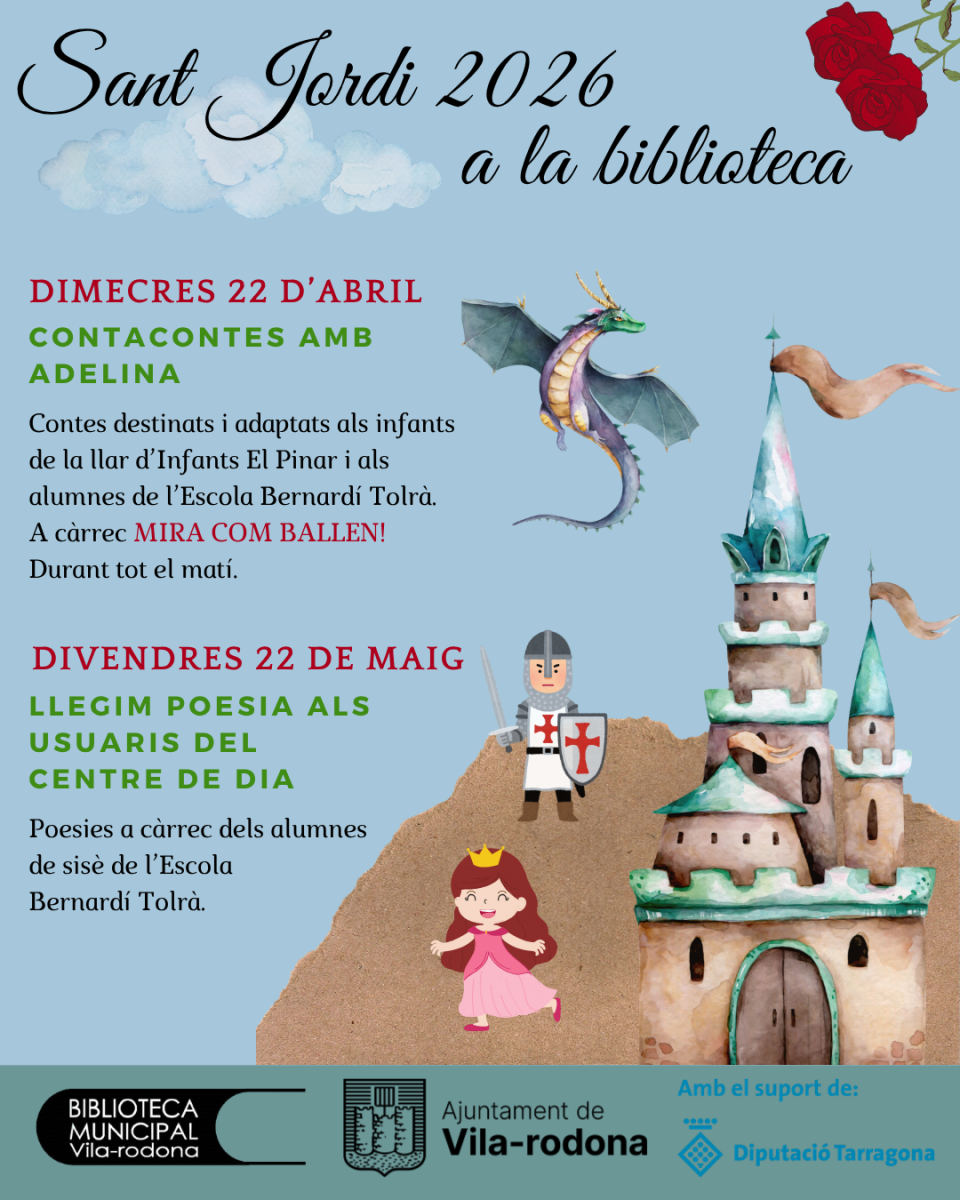 El proper dimecres 22 d’abril celebrem SANT JORDI A LA BIBLIOTECA amb els infants de la Llar d’Infant “El Pinar” i de l’ “Escola Bernardí Tolrà”.